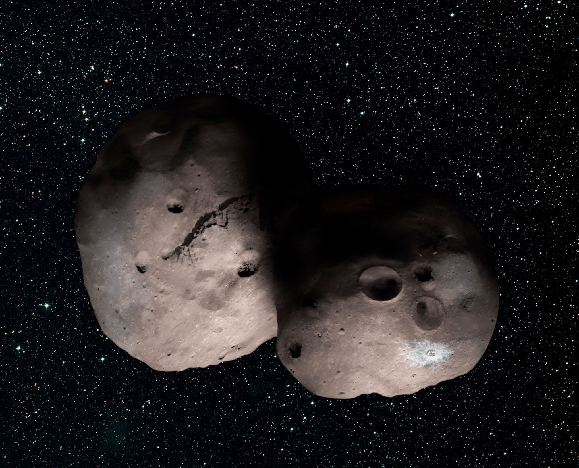 Above: One artist's concept of Kuiper Belt object 2014 MU69, the next flyby target for NASA's New Horizons mission. This binary concept is based on telescope observations made at Patagonia, Argentina on July 17, 2017 when MU69 passed in front of a star. New Horizons theorize that it could be a single body with a large chunk taken out of it, or two bodies that are close together or even touching. (NASA/JHUAPL/SwRI/Alex Parker)