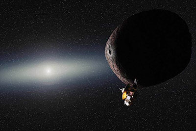 Above: Artist's concept of NASA's New Horizons spacecraft flying by a possible binary 2014 MU69 on Jan. 1, 2019. Early observations of MU69 hint at the Kuiper Belt object being either a binary orbiting pair or a contact (stuck together) pair of nearly like-sized bodies with diameters near 20 and 18 kilometers (12 and 11 miles). (Carlos Hernandez)