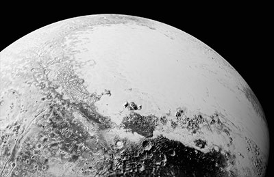 In the latest data from NASA's New Horizons spacecraft, a new close-up image of Pluto reveals a vast, craterless plain that appears to be no more than 100 million years old, and is possibly still being shaped by geologic processes. This frozen region is north of Pluto's icy mountains, in the center-left of the heart feature, informally named "Tombaugh Regio" (Tombaugh Region) after Clyde Tombaugh, who discovered Pluto in 1930.