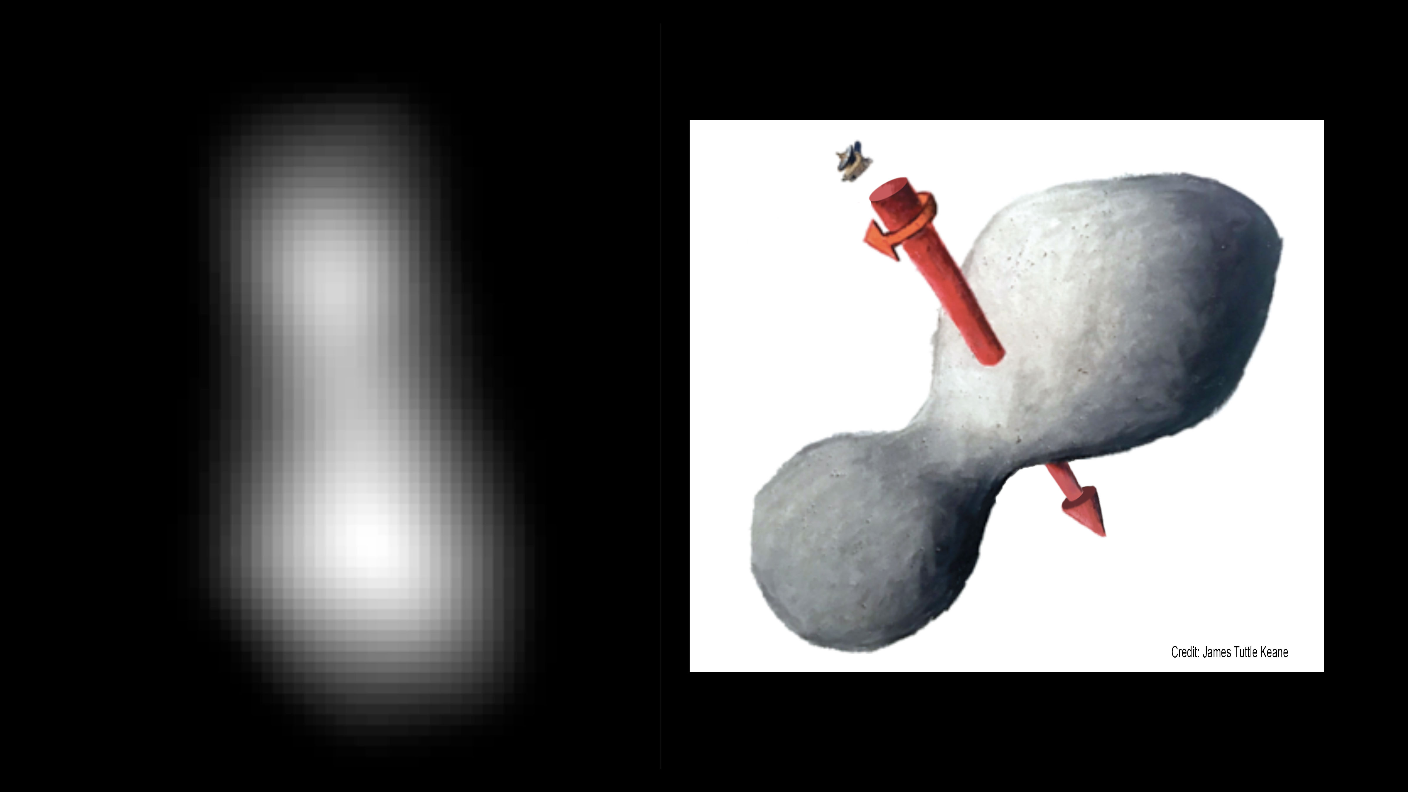 Above: At left is a composite of two images taken by New Horizons' high-resolution Long-Range Reconnaissance Imager (LORRI), which provides the best indication of Ultima Thule's size and shape so far. Preliminary measurements of this Kuiper Belt object suggest it is approximately 20 miles long by 10 miles wide (32 kilometers by 16 kilometers). An artist's impression at right illustrates one possible appearance of Ultima Thule, based on the actual image at left. The direction of Ultima's spin axis is indicated by the arrows. (NASA/JHUAPL/SwRI; sketch courtesy of James Tuttle Keane)