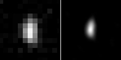 Above: Just over 24 hours before its closest approach to Kuiper Belt object Ultima Thule, the New Horizons spacecraft has sent back the first images that begin to reveal Ultima's shape. The original images have a pixel size of 6 miles (10 kilometers), not much smaller than Ultima's estimated size of 20 miles (30 kilometers), so Ultima is only about 3 pixels across (left panel). However, image-sharpening techniques combining multiple images show that it is elongated, perhaps twice as long as it is wide (right panel). New Horizons was approximately 1.2 million miles (1.9 million kilometers) from Ultima when this image was taken on Dec. 30, 2018. (NASA/Johns Hopkins University Applied Physics Laboratory/Southwest Research Institute)