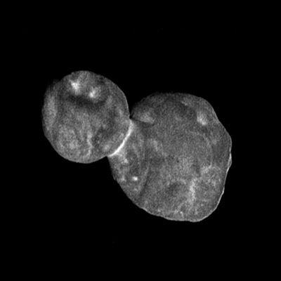 Above: This image taken by the Long-Range Reconnaissance Imager (LORRI) is the most detailed of Ultima Thule returned so far by the New Horizons spacecraft. It was taken at 5:01 Universal Time on January 1, 2019, just 30 minutes before closest approach from a range of 18,000 miles (28,000 kilometers), with an original scale of 730 feet (140 meters) per pixel. (NASA/JHU-APL/SwRI)