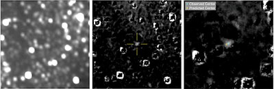 Above: At left, a composite optical navigation image, produced by combining 20 images from the New Horizons Long Range Reconnaissance Imager (LORRI) acquired on Sept. 24. The center photo is a composite optical navigation image of Ultima Thule after subtracting the background star field; star field subtraction is an important component of optical navigation image processing since it isolates Ultima from nearby stars. At right is a magnified view of the star-subtracted image, showing the close proximity and relative agreement between the observed and predicted locations of Ultima. (NASA/JHUAPL/SwRI/KinetX)