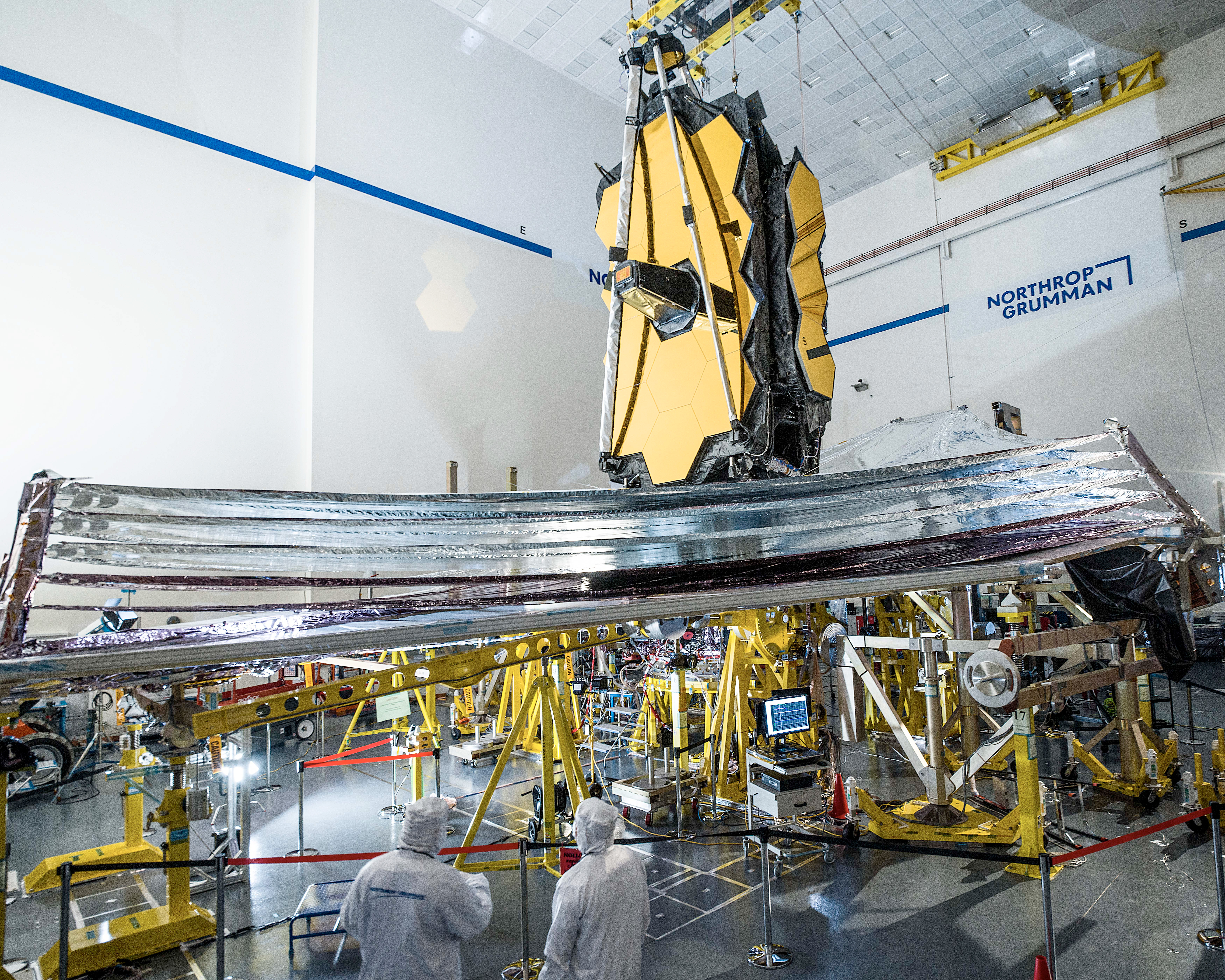 Above: The James Webb Space Telescope's final tests are underway with the successful completion of its last sunshield deployment test, which occurred at Northrop Grumman in Redondo Beach, California. (NASA/Chris Gunn)