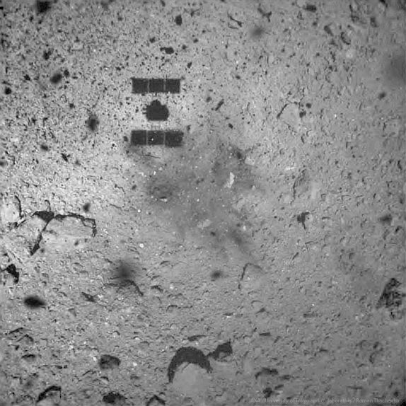 Hello Earth, hello Hayabusa2. I promised to send you some pictures of Ryugu so here’s a shot I took during my descent. Can you spot my shadow?