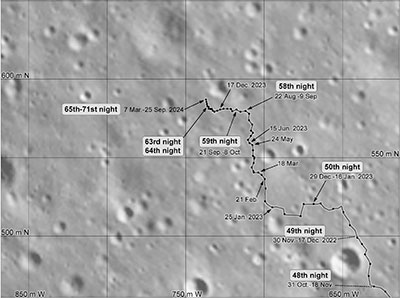 China's Yutu-2 rover may have made its final tracks, reports SpaceNews. The latest Chinese media report on the progress of Yutu-2, in September 2024, stated that the six-wheeled, solar powered rover had driven a total of 1,613 meters. However, imagery from NASA's Lunar Reconnaissance Orbiter (LRO) reveals that Yutu-2 appears to have been stationary since March 2024."NASA's Lunar Reconnaissance Orbiter images the rover roughly once a month and those images let me track rover motion," Phil Stooke, Professor Emeritus at the Institute for Earth and Space Exploration at University of Western Ontario, told SpaceNews. "Unfortunately, there has been very little motion in the last year and apparently none at all since March 2024." "Up to about February 2023 the rover was moving about 7 or 8 metres every drive and typically about 40 m per lunar day. Suddenly the drives dropped to about 3 or 4 m each and only about 8 or 10 m per lunar day," Stooke said in an email. "That lasted until about October 2023, and then drives dropped to only 1 or 2 m each. In March 2024 Yutu 2 was resting just southwest of a 10 m diameter crater, and it's been there ever since, as revealed by LRO images," Stooke added. |