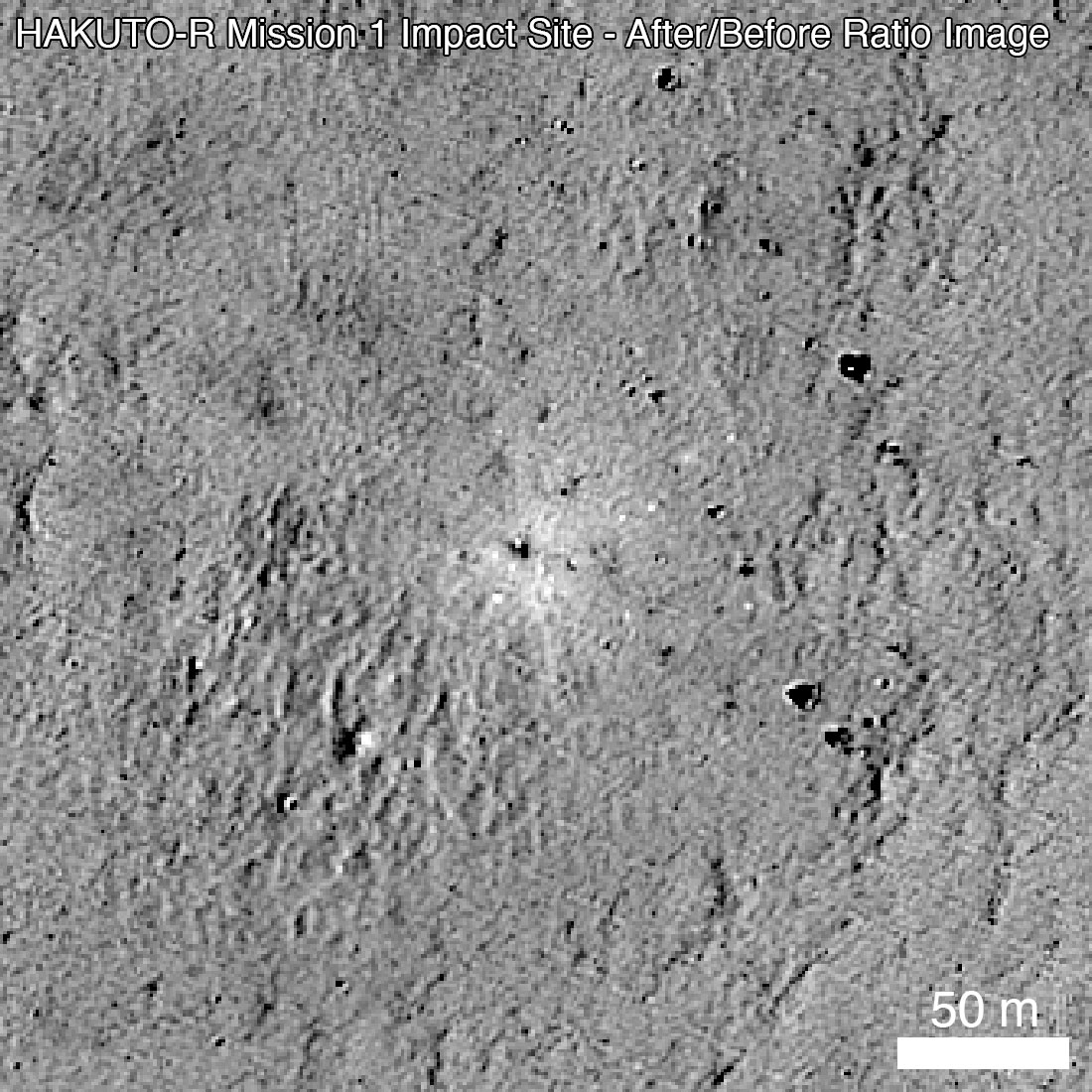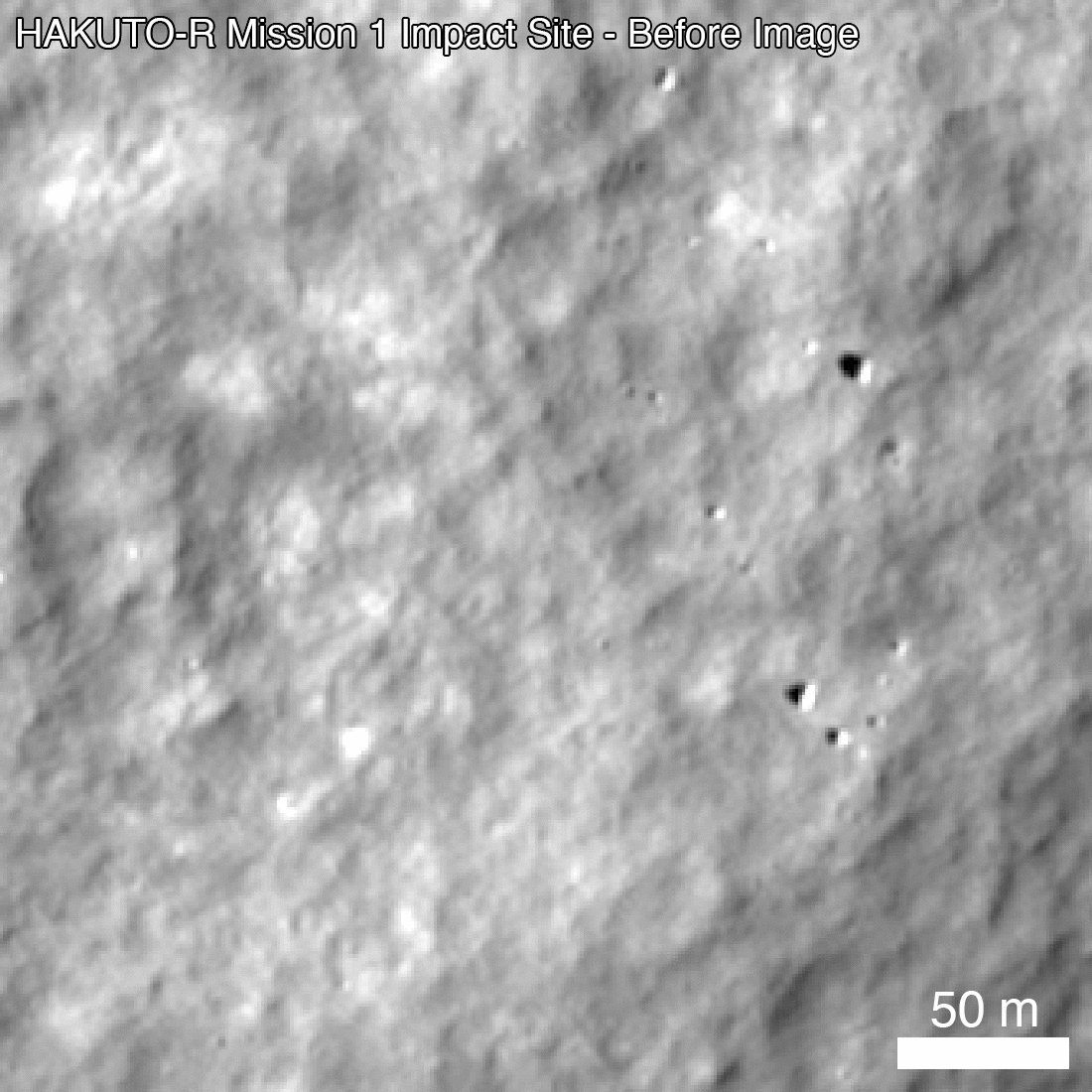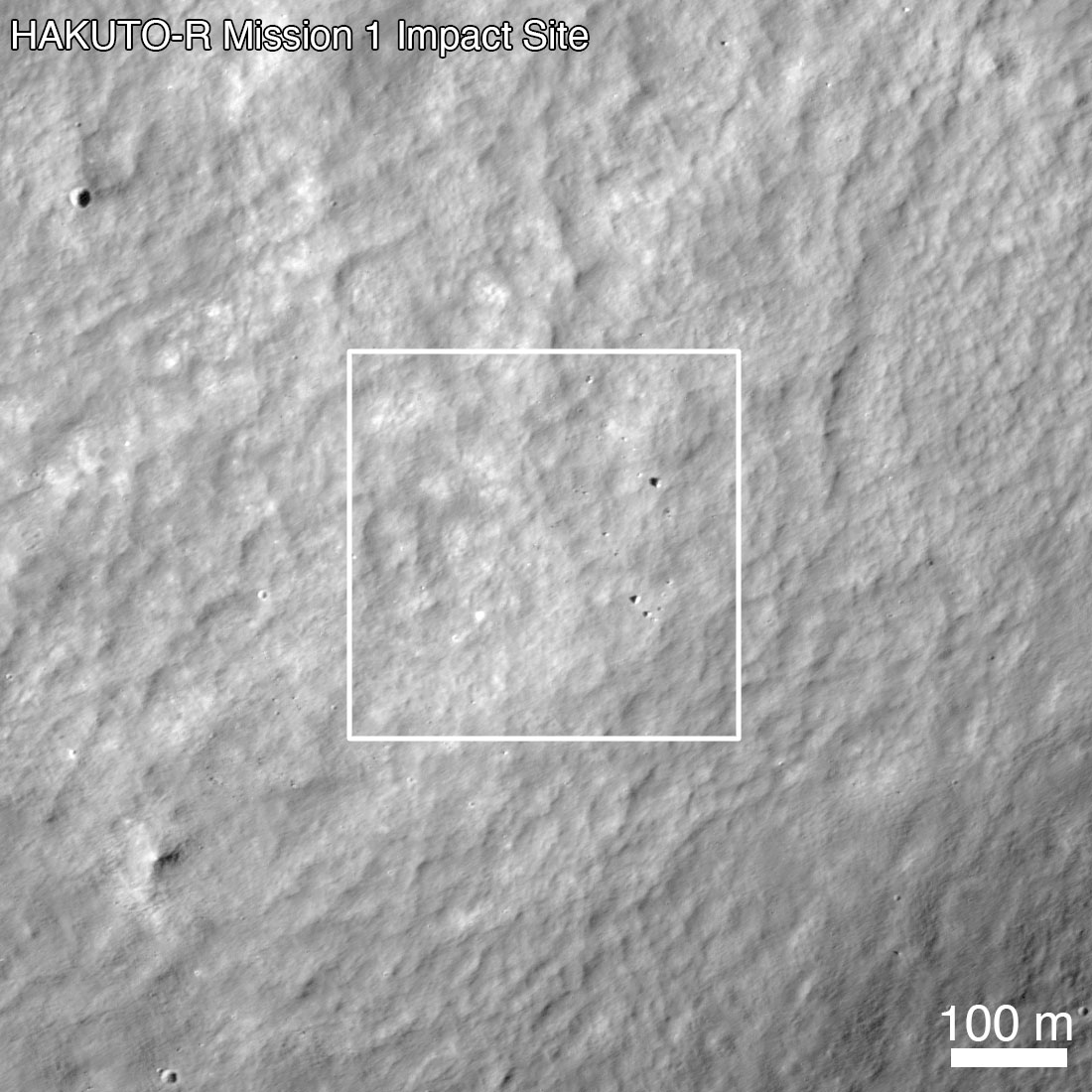 Above: HAKUTO-R Mission 1 Lunar Lander impact site, as seen by LROC the day after the attempted landing. LROC NAC image M1437131607R. (NASA/GSFC/Arizona State University)