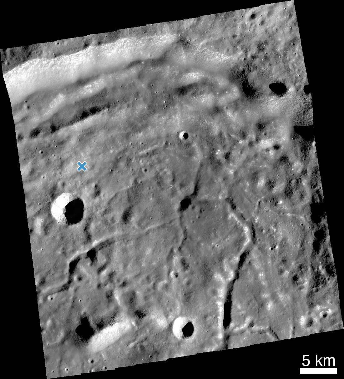 Above: LROC NAC mosaic of the HAKUTO-R Mission 1 Lunar Lander impact site made from five NAC image pairs: M1437138630L/R, 1437131607L/R, M1437124584L/R, 1437117561L/R, M1437110537L/R. The blue cross marks the impact site. (NASA/GSFC/Arizona State University)