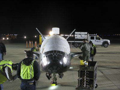 The X-37B is shown here after landing at 1:16 a.m. Pacific time today, concluding its more than 220-day experimental test mission. It was launched from Cape Canaveral Air Force Station, Fla., on April 22.