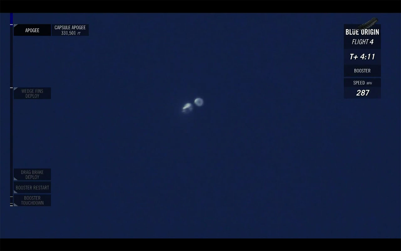New Shepard flew again on June 19, 2016, reaching an apogee of 331,504 feet (101.042 kilometers). It was the fourth flight with this booster and the sixth flight of this capsule.