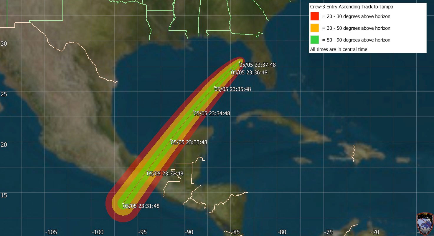 Crew-3's Dragon Endurance will splash down from the southwest, passing over southern Mexico and the Yucatán Peninsula. Here's where you might be able to see it during reentry: