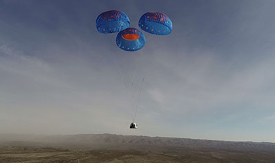 Above: The New Shepard crew capsule outfitted with astronaut experience upgrades landing at Launch Site One.