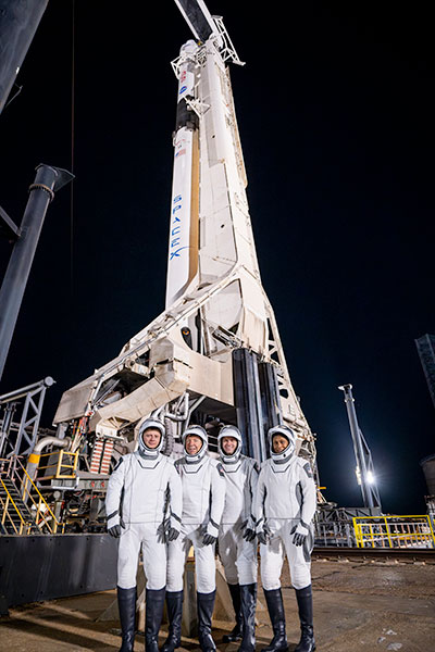 An integrated crew of four will travel to the space station aboard a SpaceX Dragon and Falcon 9 rocket. Hardware allocations for Dragon and Falcon are planned in the coming months. Once crew members are assigned, operations teams will increase crew training activities specific to the mission, including spacesuit production and testing.