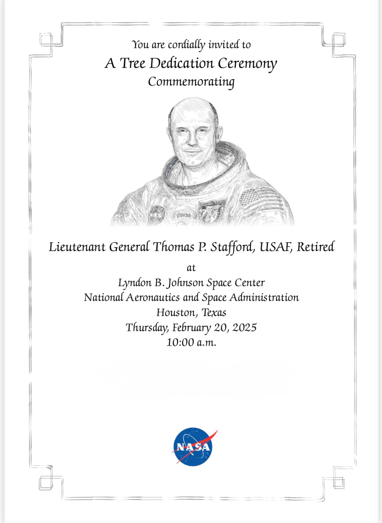 From the Stafford Air & Space Museum: Members of our team from the Stafford Air & Space Museum had the profound honor of attending a beautiful tree dedication for General Thomas P. Stafford at NASA's Johnson Space Center in Houston.Surrounded by his family, friends, and esteemed colleagues, we reflected on the incredible legacy of a man who not only shaped the course of space exploration but also touched the lives of so many with his leadership, kindness, and unwavering dedication. General Stafford's impact reaches far beyond the stars —his contributions continue to inspire generations. We were truly humbled to stand among those who knew him best and to witness this lasting tribute to his remarkable life.