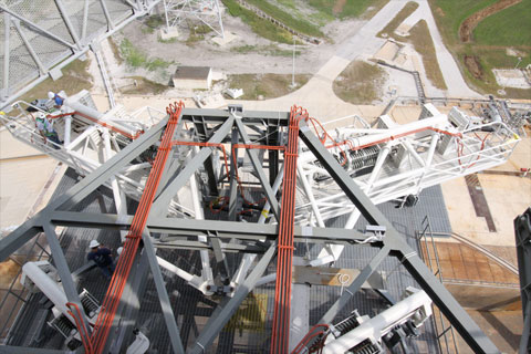 An access platform and vent line have been installed on the 255-foot level of Pad 39B to support Ares I-X. Below it on the 235-foot level is the vehicle stabilization system.