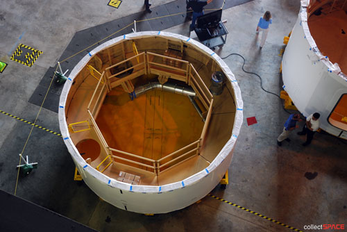 In August 2007, NASA provided the media an opportunity to see this aft skirt as it was being prepared for its 2009 flight. As part of the tour, we had the chance to step into the skirt, as the latter two photographs illustrate. Click on the photographs to enlarge.