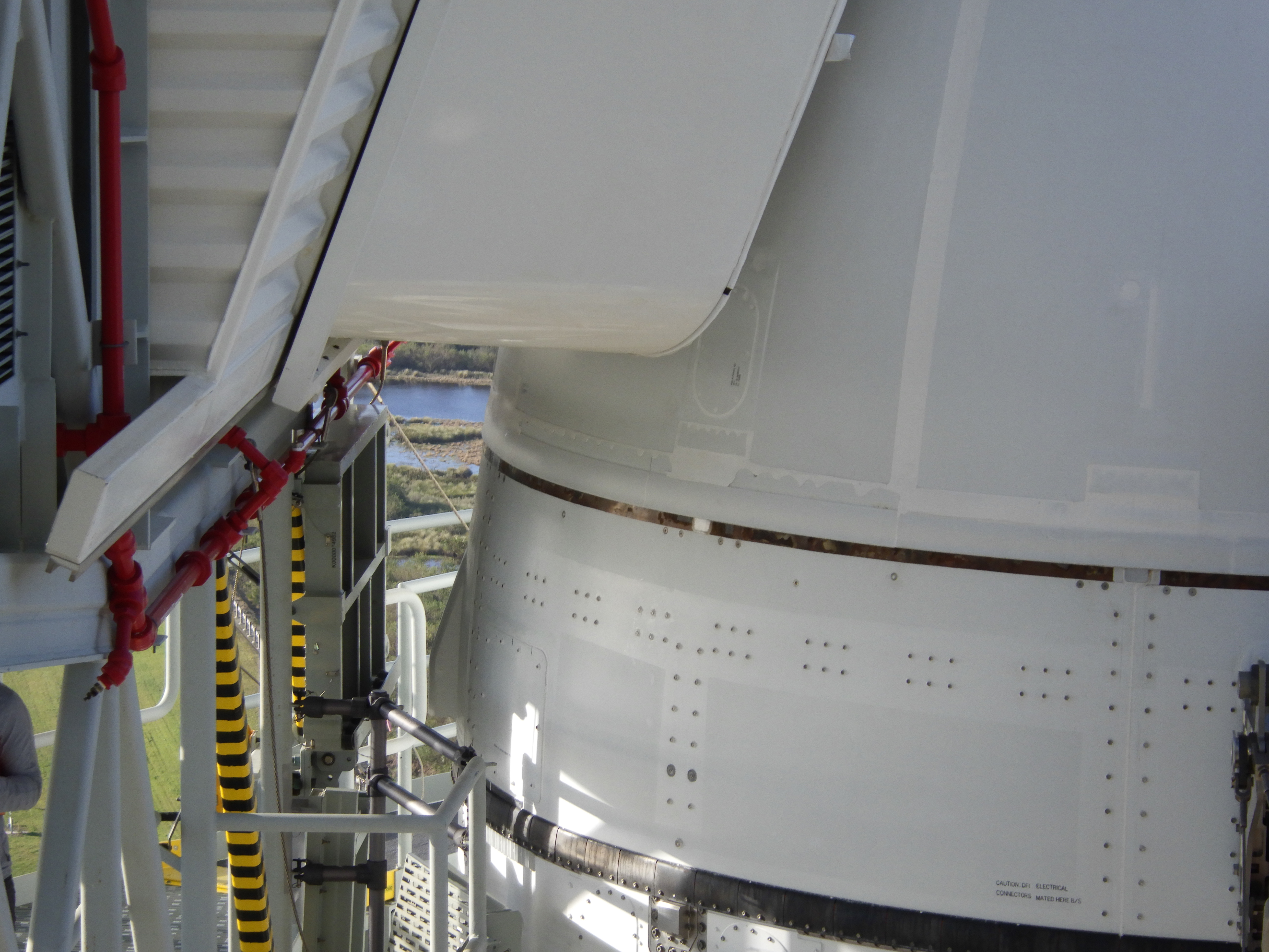 The other open item and the action that pertains to the meeting today and is going to cause us to get back together for a launch minus one day review has to do with some room temperature vulcanization or RTV material that has been de-laminated from the eastern side of the Orion spacecraft where the launch abort system's aerodynamic shell, called the ogive [pronounced oh-jive], meets up with the crew module adapter.