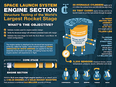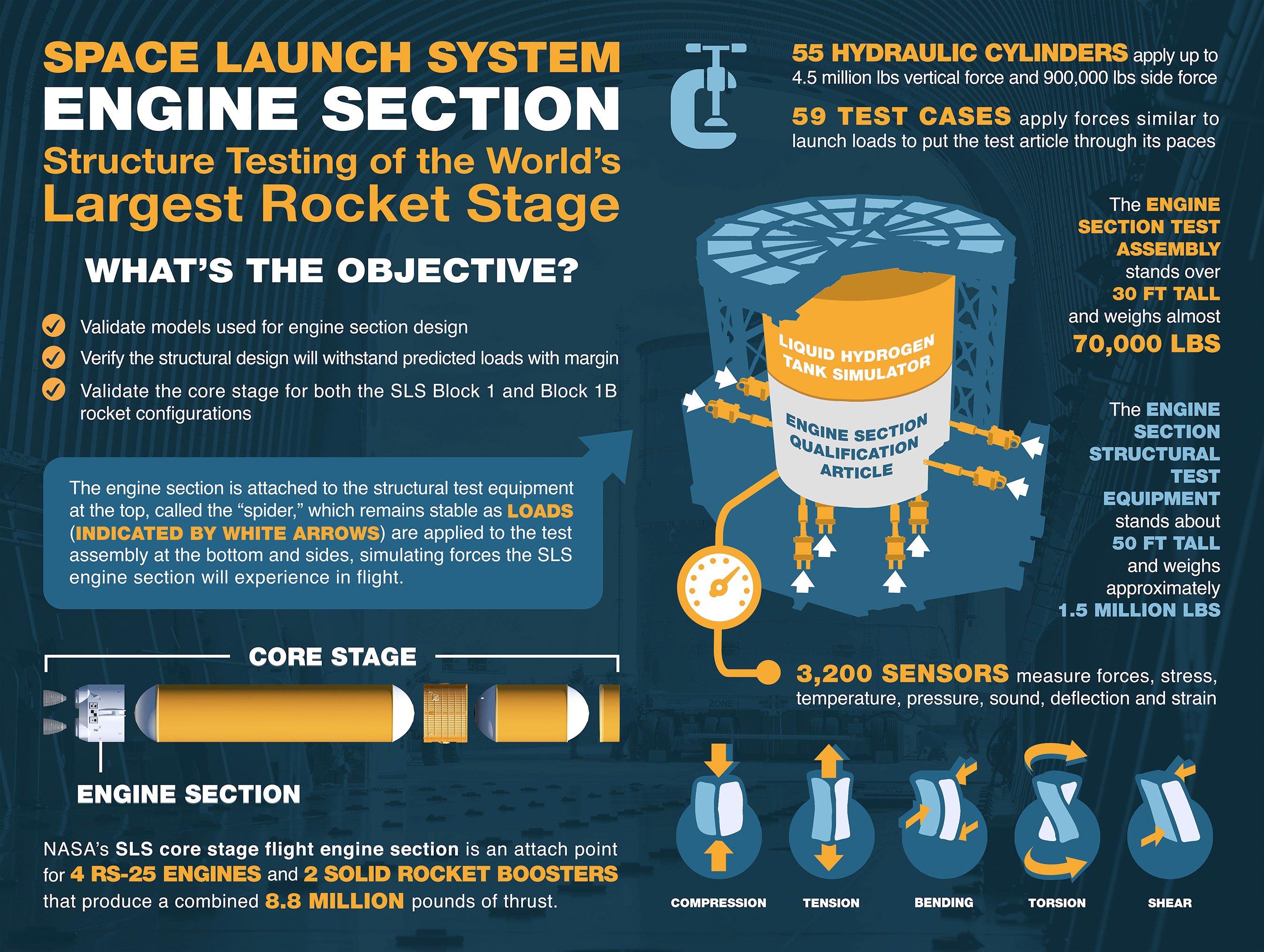 "These tests mark significant progress to the pad for the first flight of SLS," said Mark White, lead test engineer for the engine section at NASA's Marshall Space Flight Center in Huntsville, Alabama. "The tests performed by NASA with core stage prime contractor Boeing prove the hardware is strong enough to withstand the stresses and loads of launch and ascent."