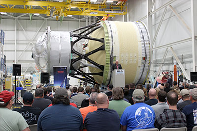 Above: Space Launch System Program Manager John Honeycutt thanks United Launch Alliance (ULA) and Boeing Co. employees for their work on the completed interim cryogenic propulsion stage (ICPS) test article during a media event Oct. 26 at ULA's facility in Decatur, Alabama. Credit: ULA