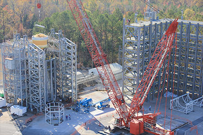 Dozens of hydraulic cylinders in the 215-foot-tall test stand will push and pull the tank, subjecting it to the same stresses and loads it will endure during liftoff and flight.