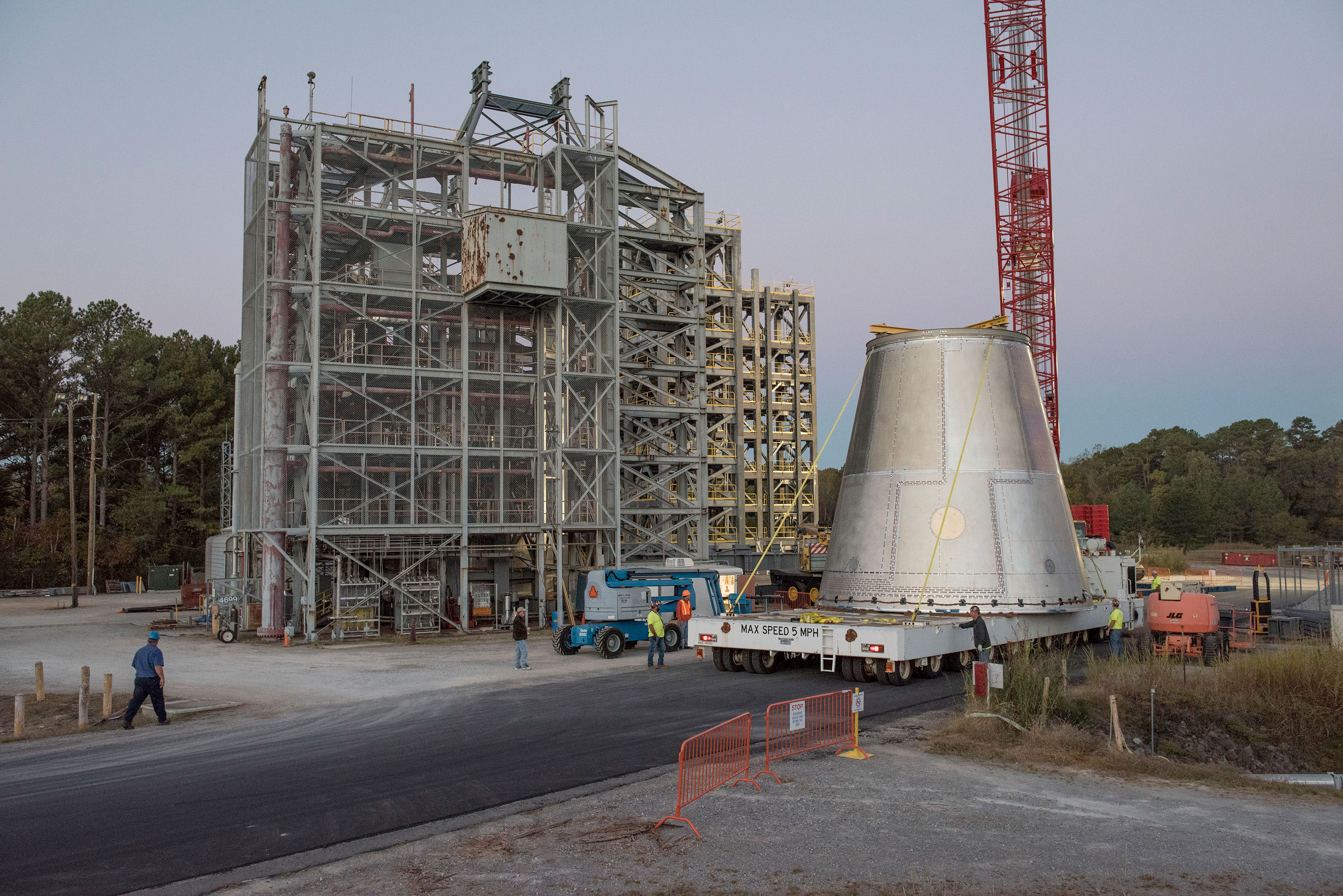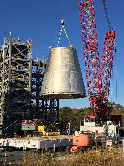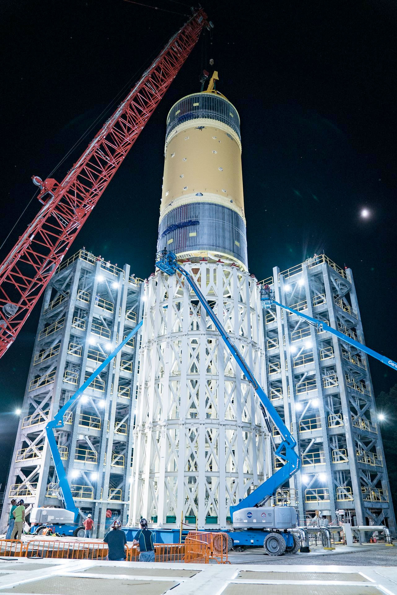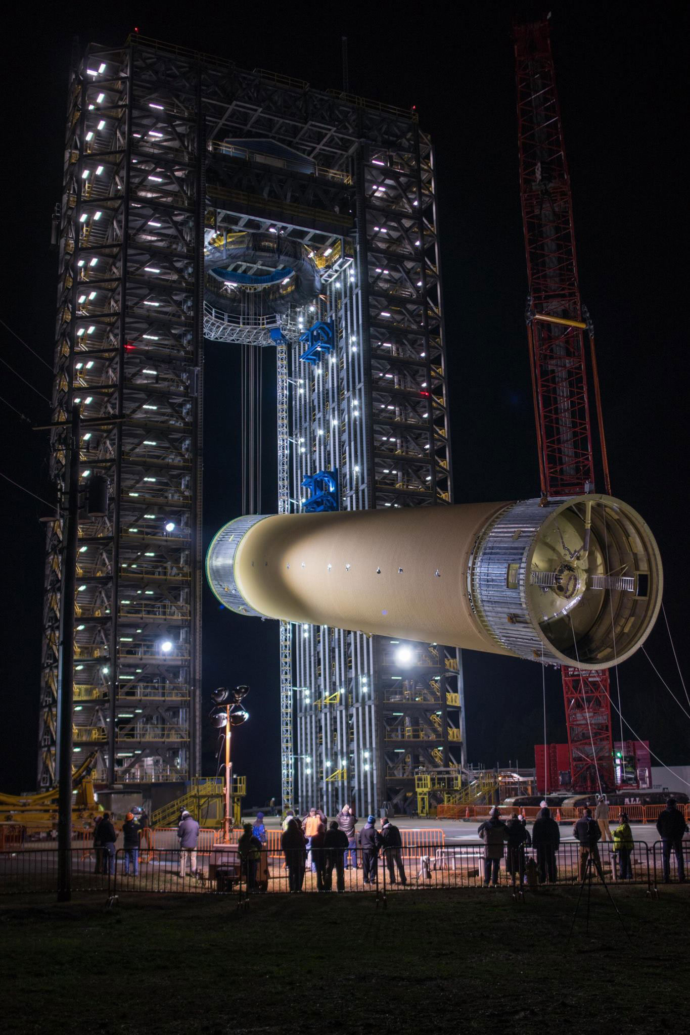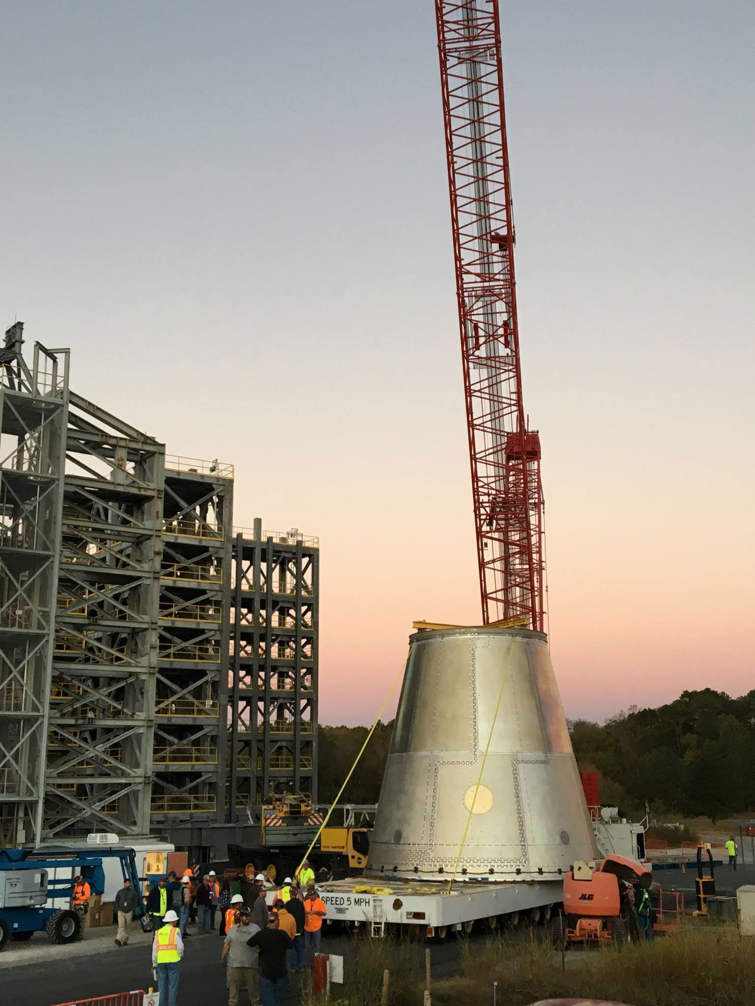 The largest piece of structural test hardware for America’s new deep space rocket, the Space Launch System, was loaded into Test Stand 4693 at NASA’s Marshall Space Flight Center in Huntsville, Alabama Jan. 14, 2019.