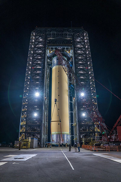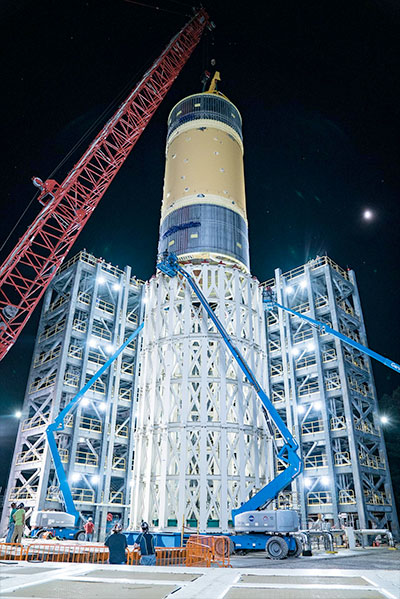 Above: The liquid oxygen tank structural test article, shown here, for NASA’s Space Launch System (SLS) rocket’s core stage was the last test article loaded into the test stand July 10, 2019. (NASA/Tyler Martin)