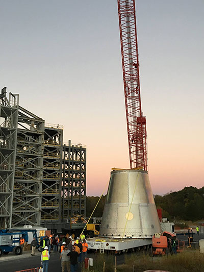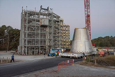 The hardware — some being almost exact to flight specifications — will be pushed, pulled and twisted during the tests. The ICPS joins two other pieces of hardware already installed in the stand. The core stage simulator was loaded into the test stand Sept. 21, with the launch vehicle stage adapter (LVSA) following on Oct. 12. The core stage simulator is a duplicate of the top of the SLS core stage that is approximately 10 feet tall and 27.5 feet in diameter. It was designed and built at Marshall.