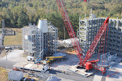 Above: Two cranes lift the interim cryogenic propulsion stage test article, built and delivered by United Launch Alliance in Decatur to NASA's Marshall Space Flight Center in Huntsville, Alabama. Credit: NASA/MSFC/Emmett Given