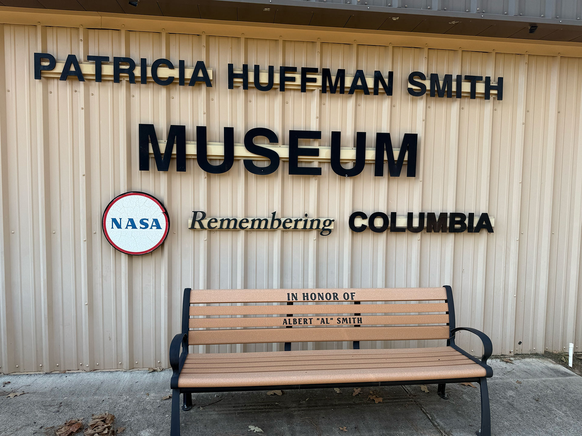 I visited the Patricia Huffman Smith NASA Museum "Remembering Columbia" in Hemphill, Texas, this weekend (Sept. 26-28) and I am glad I made the trip. If you are in the area, it is worth a visit.  The museum is divided into three areas. The first are displays devoted to each of Columbia's missions, from STS-1 through STS-107. NASA and astronauts who flew on Columbia have donated artifacts for display, including a medium-size U.S. flag that flew on STS-1.