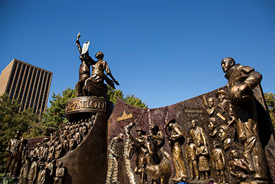 The Texas African American History Memorial, honoring the contributions of African-Americans to Texas history, was dedicated on the south lawn of the Texas Capitol in Austin on Nov. 19, 2016. It is only the second memorial dedicated to a specific ethnic group on the statehouse grounds, after the Tejano Monument, devoted to Mexican-American history in Texas. Relevant to this site's focus, the monument prominently features an astronaut, and was sculpted by Ed Dwight, who before becoming an artist was a test pilot who was billed by the media in the 1960s as the "first African American astronaut trainee." Photo credit: Gabriel Cristóver Pérez/KUT News  | |
