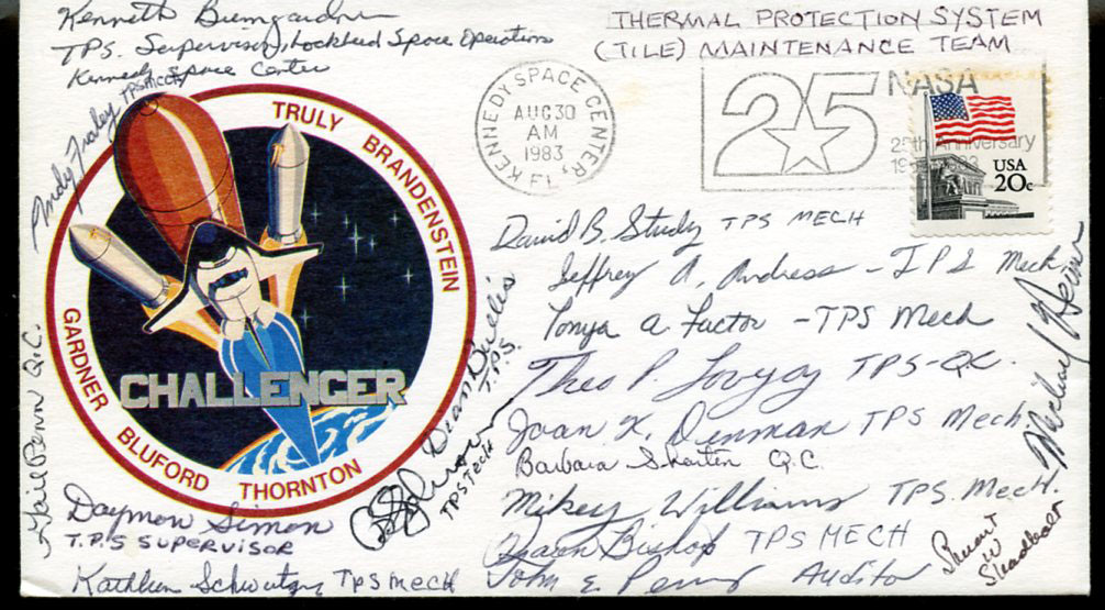 Regarding the autographs, Abbey accounted for five, while Ed Gibson accounted for three. But still not complete, the cover was sent out four more times to end up in its current stage. Three more signatures have been identified as those of Joseph D. Atkinson, Martin L. Raines and Duane L. Ross. So represented here are signatures of 13 of the 15 Astronaut Selection Board members for Group 8. Not signing are Glenn Lunney and Duane L. Ross.  Most of the 35 new astronauts that the astronaut selection board selected later flew on space shuttle Challenger. This cover for Challenger's STS-8 flight is signed by about 20 of the tile experts who were involved in the maintenance of Challenger's (TPS) Thermal Protection System (mainly tiles). All autographs were applied with just one mailing to Kennedy Space Center. |