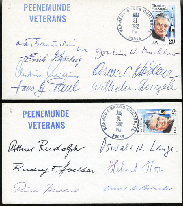 Well, this is a forum for autographs, so here are a lot them.This thread is intended to highlight autographs of lesser-known space personnel, but they all did their part in America's success in space. The autographs presented below of German rocket pioneers do include mostly lesser-known space personnel, but with several significant exceptions. For example, this Wernher von Braun tribute cover is signed by three top NASA leaders, including Kurt Debus, KSC Director; Arthur Rudolph, Saturn V Manager at Marshall Space Flight Center, AL; and Eberhard Rees, MSFC Director.  This postcard pictures Wernher von Braun in his office in Huntsville, along with a Redstone rocket launch cover signed by von Braun. The cover marks the final Redstone test flight before Alan Shepard's Mercury-Redstone 3 sub-orbital flight.  While all of the von Braun Rocket Team members from Peenemuende, Germany, contributed much to the US rocket and space programs, they certainly had a dark side. Arthur Rudolph, and the entire German rocket team, came to the US as part of Operation Paperclip after World War II. But previously during WWII, Rudolph was directly involved in the forced use of slave laborers to manufacture V-2 rockets that were used against civilian populations. Sadly, after his distinguished career in the US, he fled the the country to avoid a possible war crimes indictment for his involvement in the use of slave laborers to produce weapons of war against civilians.