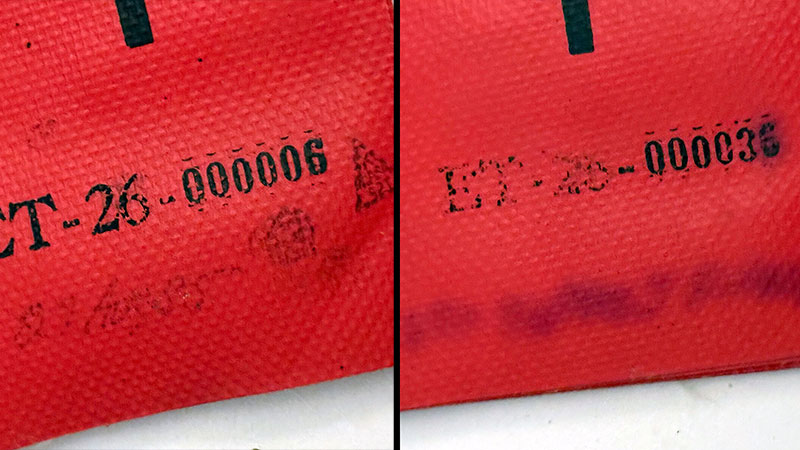 Close-up detail of two of the 18 shuttle "Return Before Flight" tags purchased off eBay. All were marked "ET-26" with a serial number. Some included additional stamps and handwritten notations. Most of the latter, though, has bled into the fabric such that it can no longer be read. (collectSPACE) |