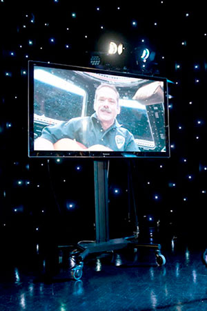 Astronaut Chris Hadfield (left) performs from on the International Space Station while Barenaked Ladies frontman Ed Robertson sings with his bandmates and a youth choir in Toronto, Canada, for the first Earth and space duet of an original song. (CBC Music)