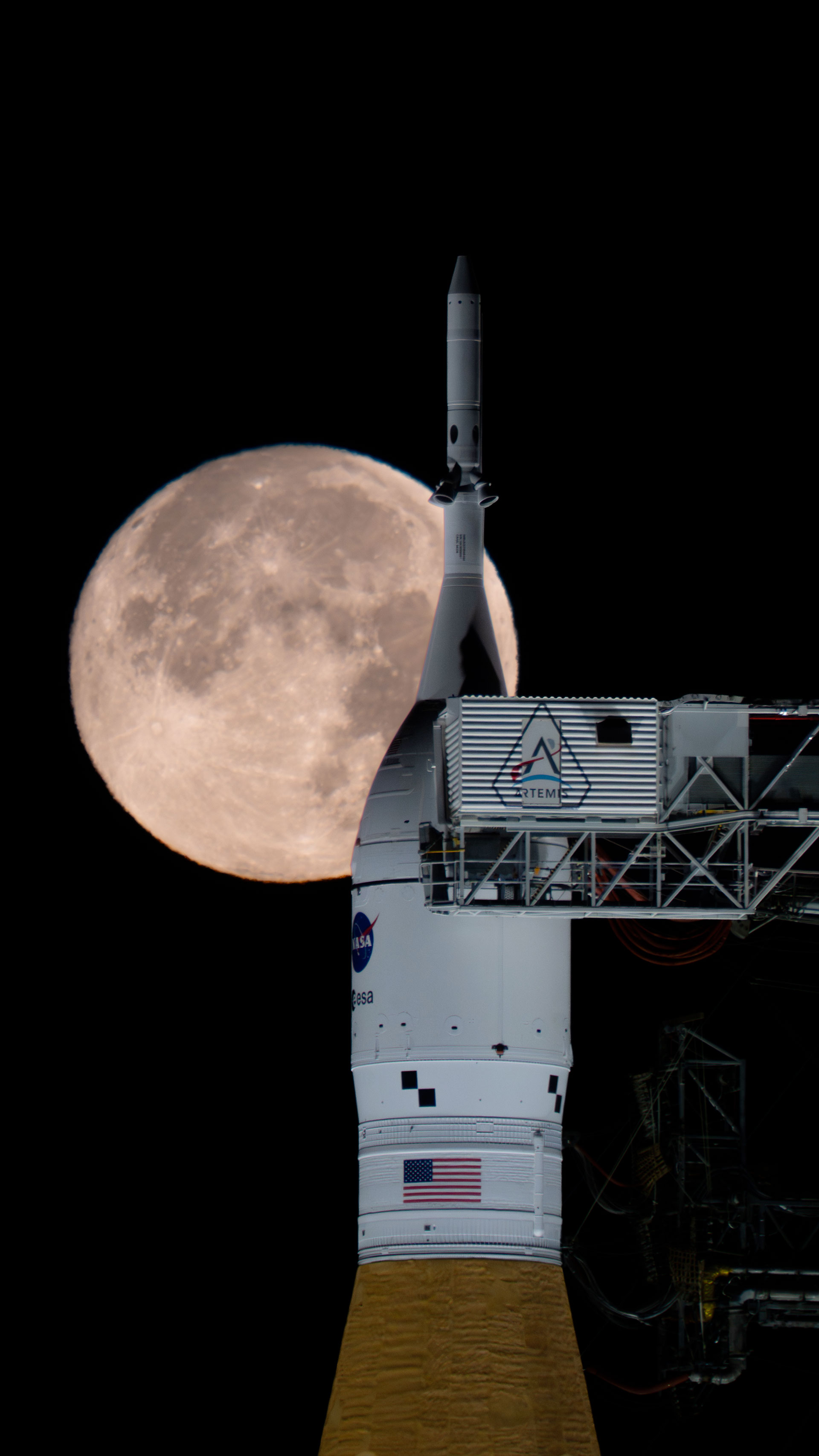 A full moon is seen shining over NASA's Space Launch System (SLS) rocket atop the mobile launcher in the early hours of Feb. 1, 2026 (NASA/Brandon Hancock)