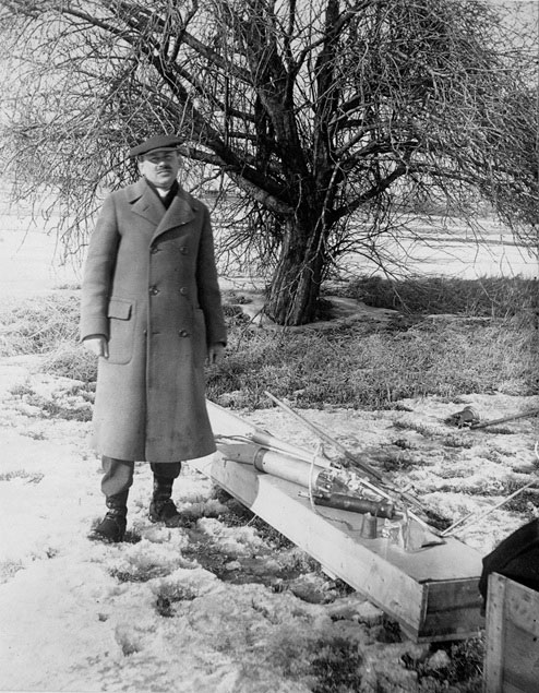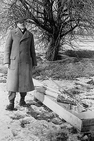 Robert Goddard with the recovered pieces of his first liquid-fueled rocket, later nicknamed "Nell," after its two-second flight in Auburn, Massachusetts, March 16, 1926. (Esther Goddard/Clark University)