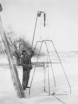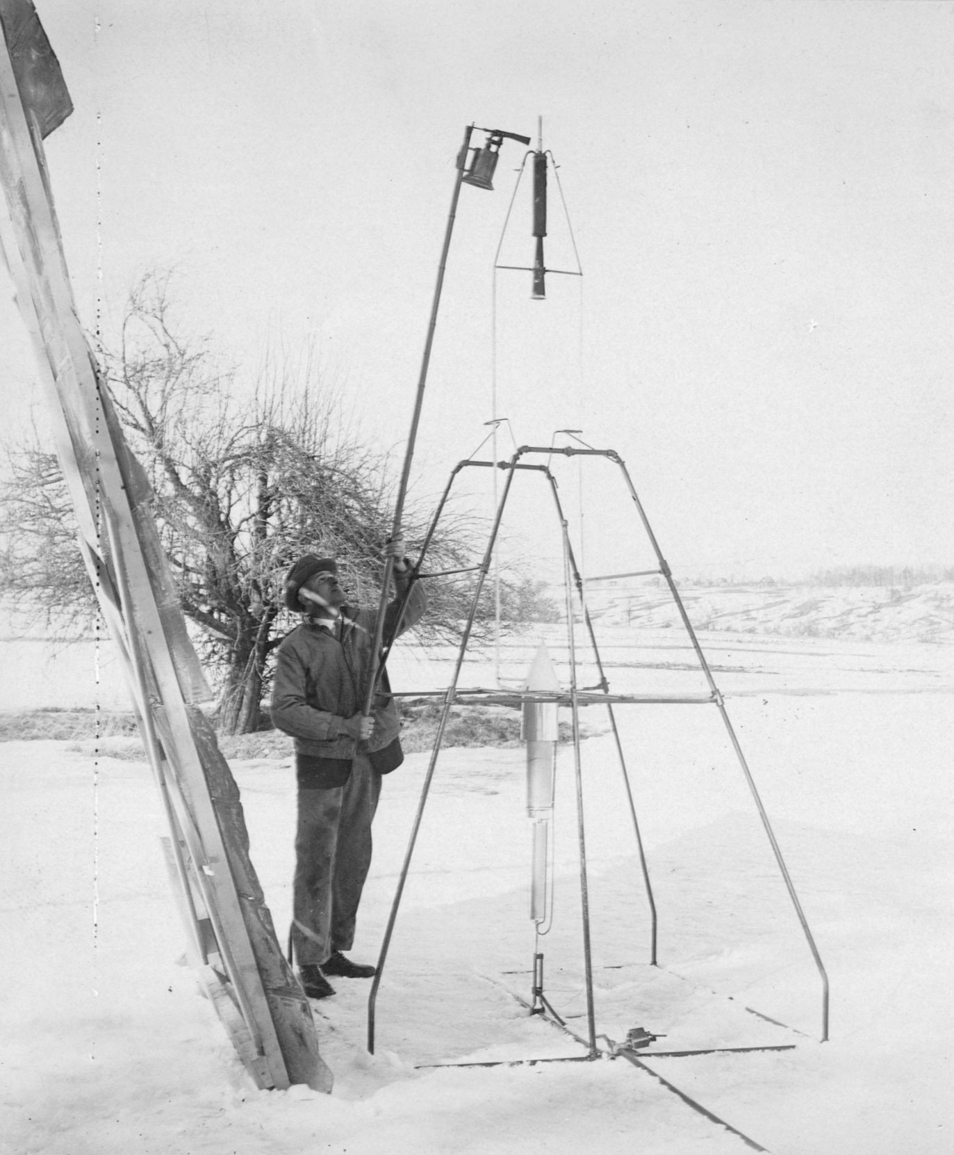 Henry Sachs, Robert Goddard's assistant, ignites the first liquid fuel rocket on March 16, 1926. (Esther Goddard/Clark University)