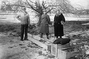 Henry Sachs, Percy Roope and Esther Goddard with parts from the first liquid-fuel rocket after its history-making flight in Auburn, Massachusetts, March 16, 1926. (Robert Goddard/Clark University)