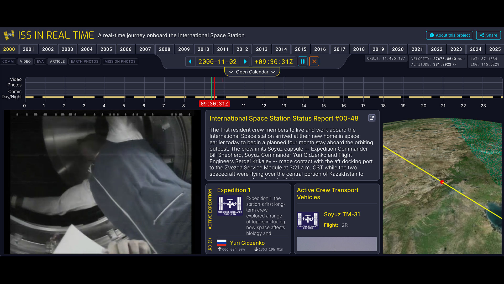 Fortunately, the astronauts and cosmonauts on the space station have devoted some of their work time and a lot of their free time to taking photos, filming videos and calling down to Earth. Much of that data has been made available to the public, but in separate repositories, with no real way to correlate or connect it with the timeline on which it was all created.
