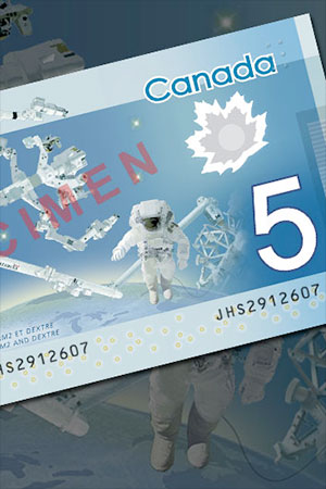 The note's design also includes a spacewalking Canadian astronaut, identified by the country's red and white maple-leaf flag depicted on the arm of the spacesuited figure.