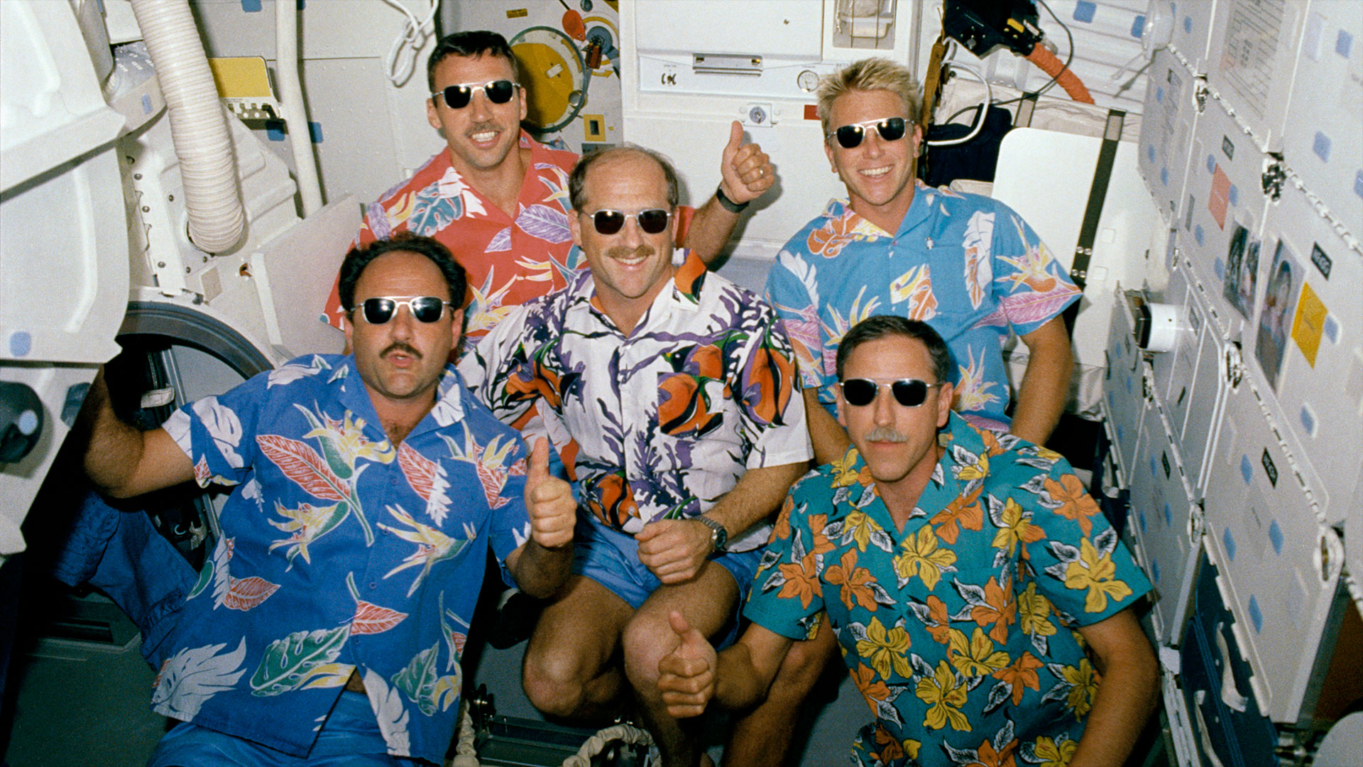 Commander Rick Hauck (at center) with his STS-26 crewmates Mike Lounge, David Hilmers, Pinky Nelson and Dick Covey in their Hawaiian shirts on space shuttle Discovery's flight deck. (NASA)