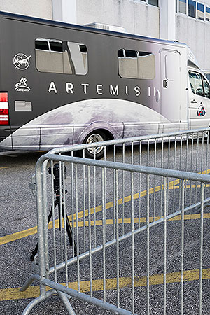 Parked outside of their crew quarters and suit-up room was their ride to their rocket, "Astrovan II," a modified Airstream motorhome. The almost 25-foot-long (8-meter) crew transport vehicle (CTV) was custom wrapped with graphics depicting the moon, the Artemis II mission patch and program insignia.