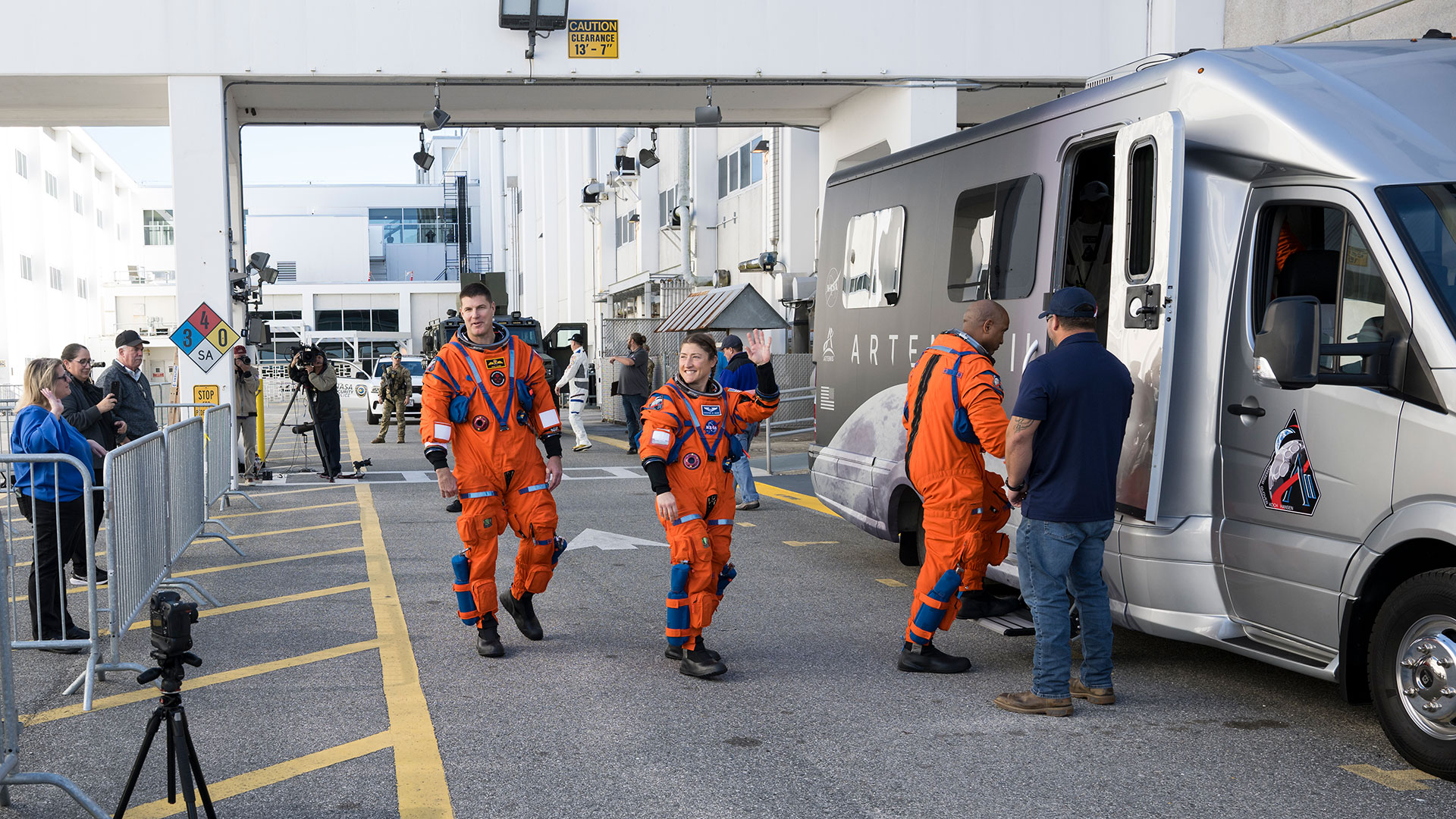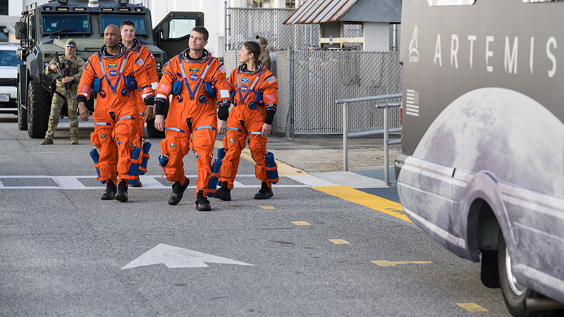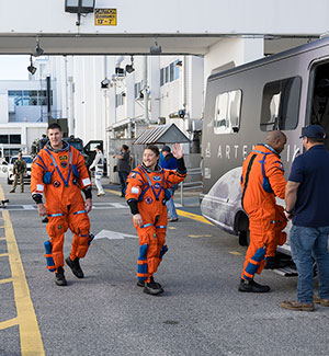 The Artemis II crew (from left to right) of Victor Glover, Jeremy Hansen, Reid Wiseman and Christina Koch exit the Neil A. Armstrong Operations and Checkout Building at NASA's Kennedy Space Center in Florida for the waiting Astrovan II transport vehicle. (NASA/Aubrey Gemignani) |