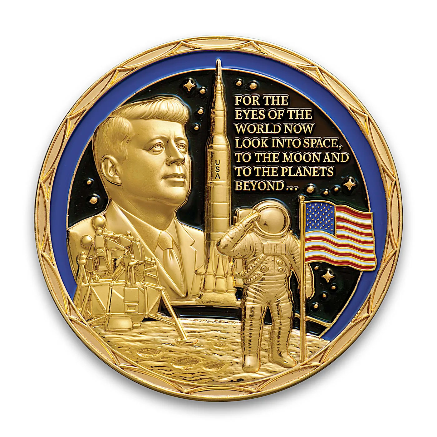 The front of every coin displays iconic imagery; Issue One, The New Frontier features a portrait of JFK, his inspiring quote, "For the Eyes of the World Now Look Into Space, to the Moon and to the Planets Beyond...", along with the Saturn V rocket, the lunar landing and more. The backs of each coin feature imagery commemorating milestones of the American space program, from Apollo to Artemis and into the future, along with the inscriptions "The New Frontier for All Mankind" and "Commemorative Challenge Coin".
