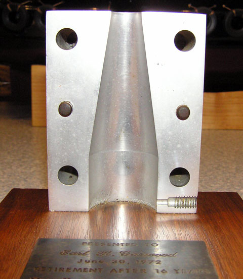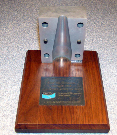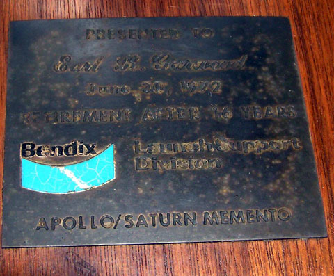 On the way back from Orlando, we stopped in a consignment shop and found an artifact. It is a display for the retirement of a Bendix-Launch Support Division employee. The plate on the display states that it is an Apollo/Saturn Memento. Does anyone know what this might be?