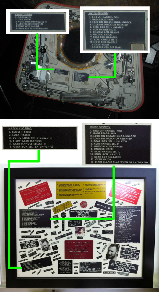 Somewhat to my surprise the plaques of the Apollo 11 hatch at the National Air and Space Museum differ altogether, covering cabin pressurization and de-pressurization. The only other "stickered" hatch photo I found was for A17. Wasn't enough resolution to read the details but it was also clearly a different label versus Apollo 11/A13.