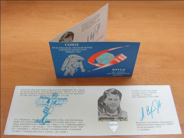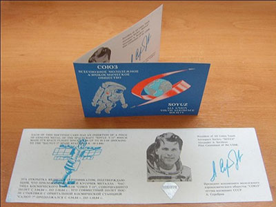 I had a similar presentation in the form of a laminated trading card with a small piece of metal attached it to. These were products of the All-Russian Youth Aerospace Society (VAKO) "Soyuz," the first scientific-educational youth society in Russia, headed by cosmonaut Alexander Serebrov. |