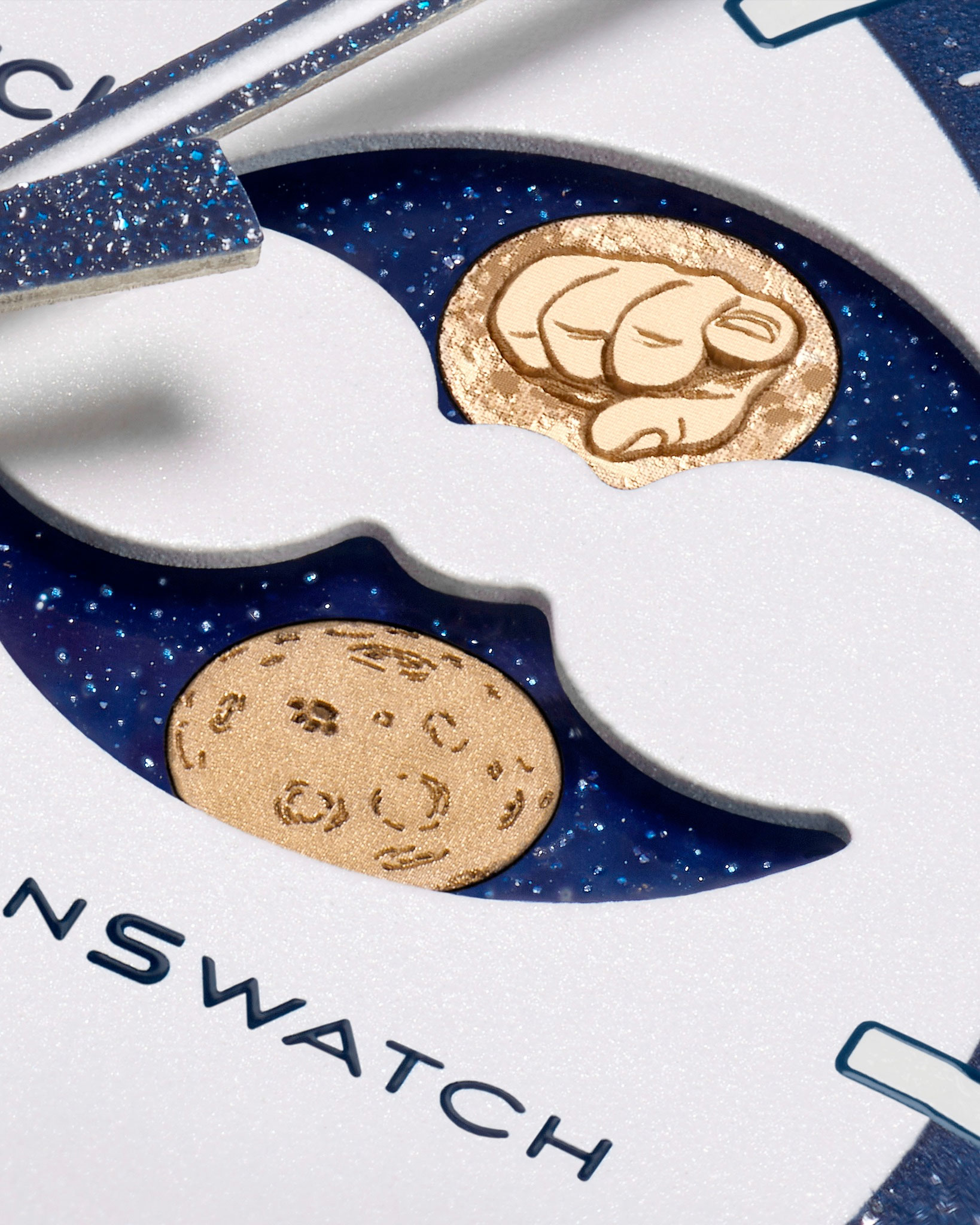 Unlike the other models in the Bioceramic MoonSwatch Collection, the blue Bioceramic bezel features a pulsometer scale with white markers. This model stands out with its moon phase function, arguably the most poetic of all watch complications. Two oversized blue moons rest against a dark blue moon phase disc, which rotates in the subdial set at 2 o’clock. Under UV light, a secret detail appears on the moon phase mask and disc. A moon with various shades of blue can be seen on the battery cover.