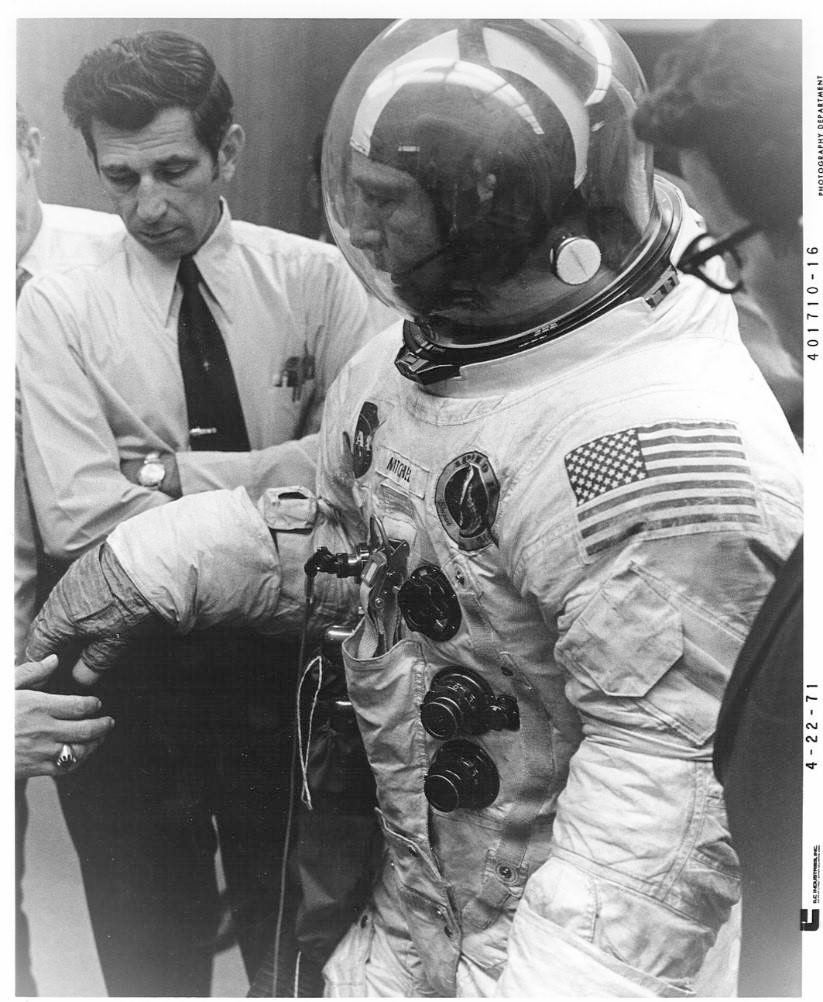 Here is a description of Ed Mitchell's lunar suit problem from "Lunar Outfitters, Making the Apollo Space Suit" author, Bill Ayrey: During the Apollo 14 mission, Edgar Mitchell had just pressurized his suit in the Lunar Module prior to opening the door for his EVA. He radioed back to Houston to say that he thought one of the restraint cables in his right glove wrist area may have broken because his hand was being somewhat pulled down and to the right. After consulting between NASA and ILC engineers, a decision was made to continue with the EVA. All went well during his time on the moon, but the EVA gloves were returned to earth for evaluation. Mitchell's suit and gloves were sent to ILC in Dover. DE., and a month or so later, Edgar Mitchell flew to ILC and got back into his suit (now coated in Lunar dust) and demonstrated the problem he experienced in the presence of engineer Richard Pulling and others. It was determined that the cables were not installed onto the wrist hardware symmetrically, and as a result, the glove was being pulled to the side. The date on this ILC photo of Mitchell is April 22, 1971.  |