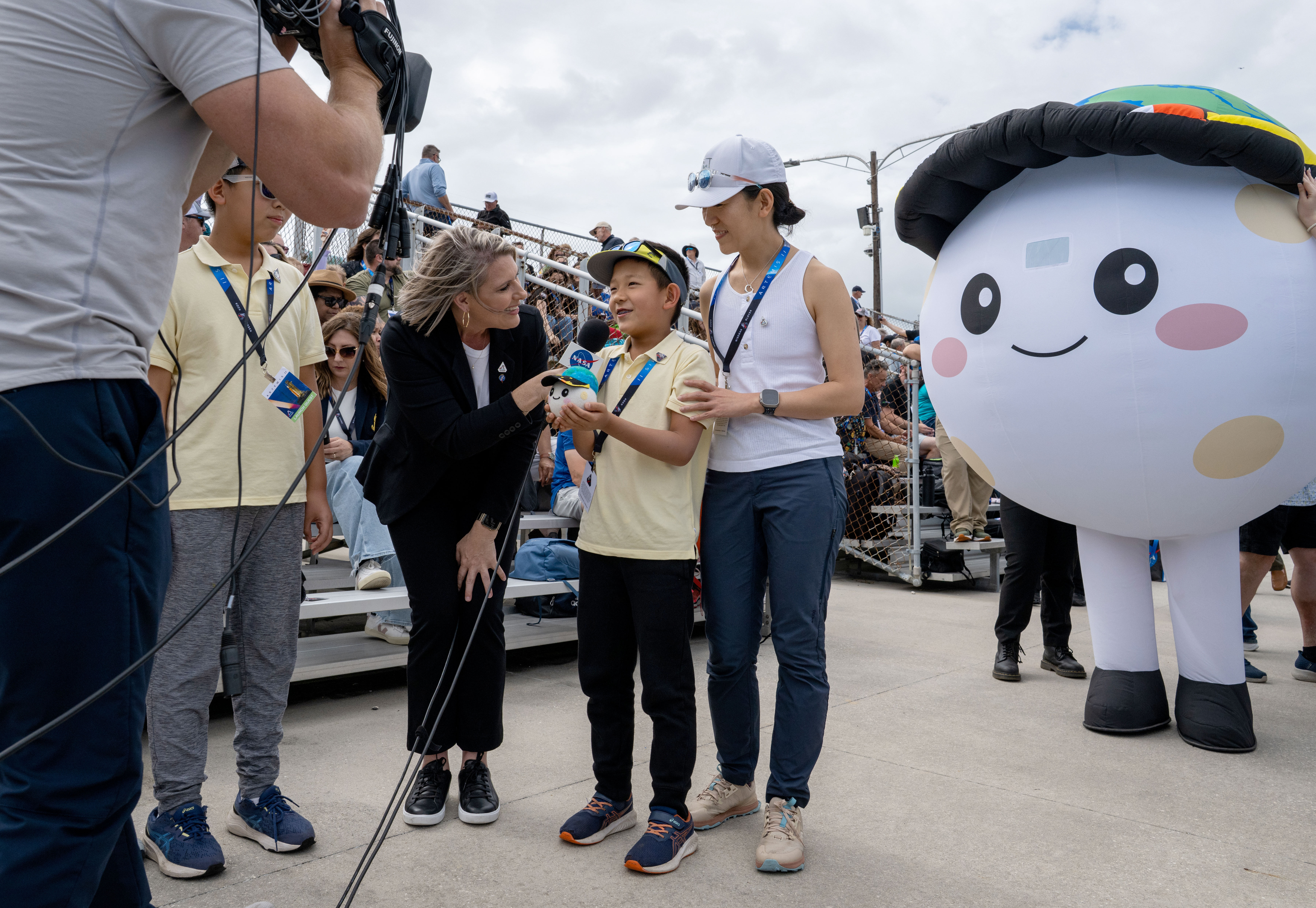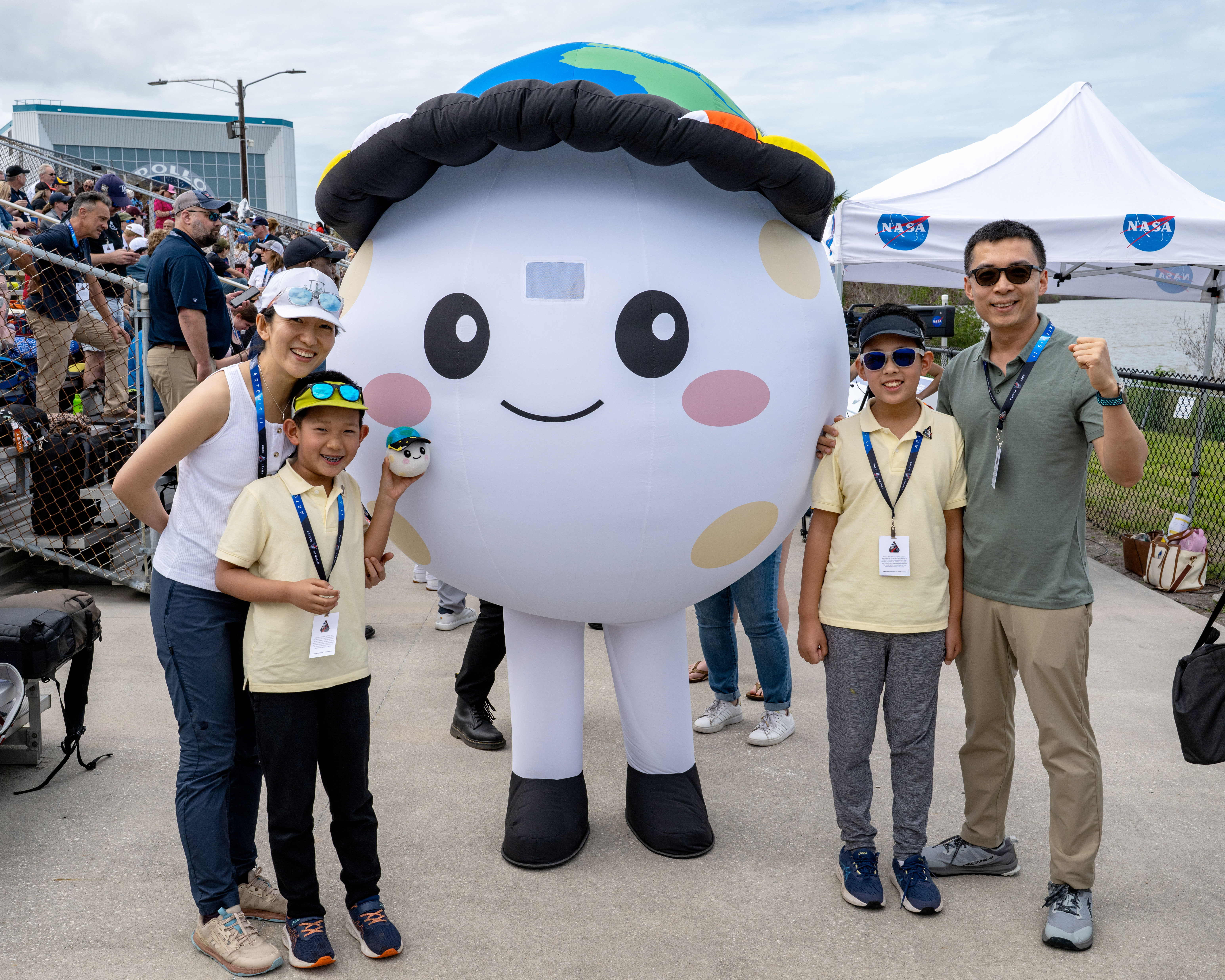 Lucas Ye, designer of zero gravity indicator "Rise," and his family pose for a photo at the Banana Creek viewing site as the countdown progresses for the launch of the Artemis II mission, Wednesday, April 1, 2026, at NASA's Kennedy Space Center in Florida.